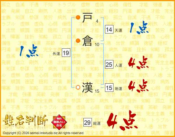 生活面を象徴する運勢です。外部から受ける影響力を表し、結婚運、家庭運や職場、環境への順応性を表します。総運から人運を引いた画数。姓や名が1文字の場合を除く。