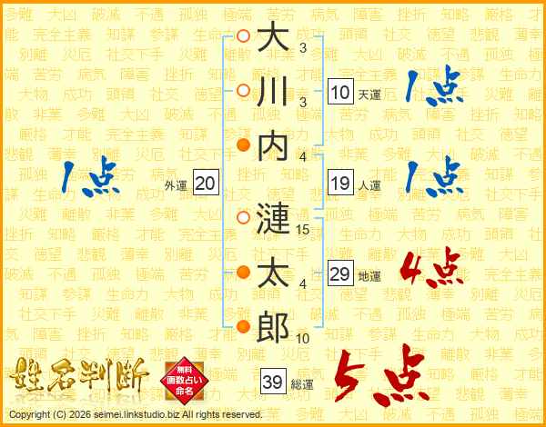 大川内漣太郎さんの総運は39画の5点!