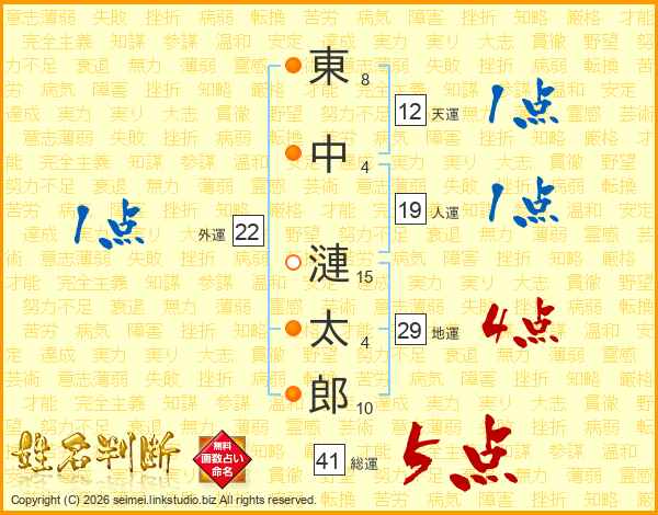 東(8画)中(4画) 漣(15画)太(4画)郎(10画)