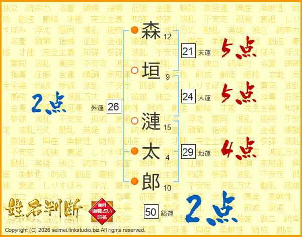 森(12画)垣(9画) 漣(15画)太(4画)郎(10画)