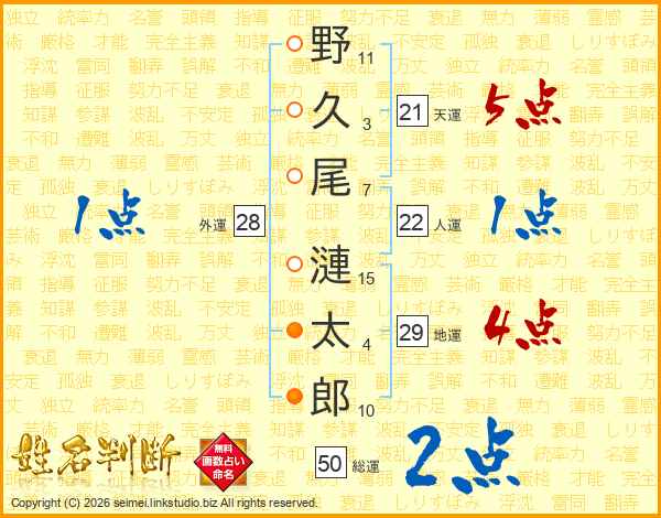 野(11画)久(3画)尾(7画) 漣(15画)太(4画)郎(10画)
