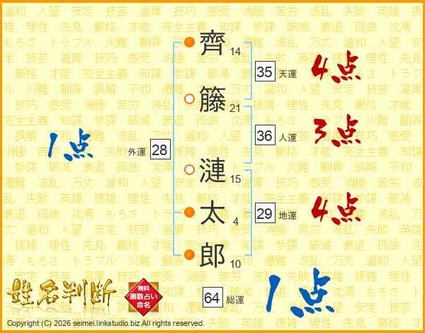 齊籐漣太郎さんの総運は64画の1点!
