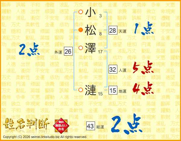 小松澤漣さんの総運は43画の2点!