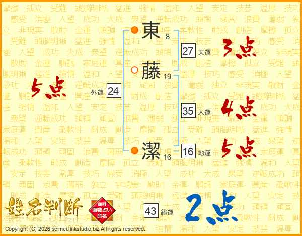 東(8画)藤(19画) 潔(16画)