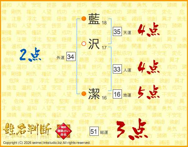 藍(18画)沢(17画) 潔(16画)