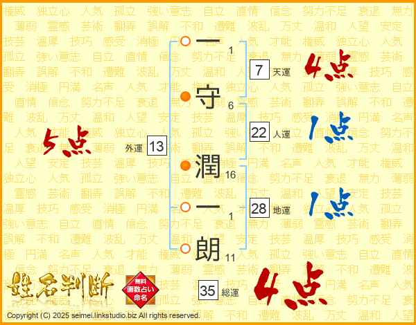 一(1画)守(6画) 潤(16画)一(1画)朗(11画)