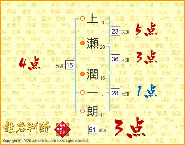 上(3画)瀬(20画) 潤(16画)一(1画)朗(11画)