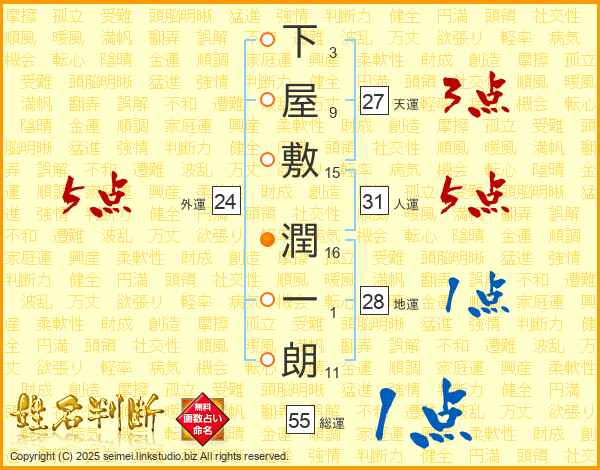 下(3画)屋(9画)敷(15画) 潤(16画)一(1画)朗(11画)