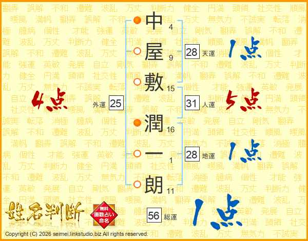 中(4画)屋(9画)敷(15画) 潤(16画)一(1画)朗(11画)