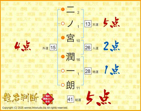 あなたの人生を表す1番重要な運勢です。生涯を通じて影響する総合運となり、主に50歳以降の晩年期に影響を及ぼします。苗字と名前の合計画数。