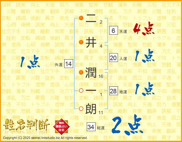 二(2画)井(4画) 潤(16画)一(1画)朗(11画)