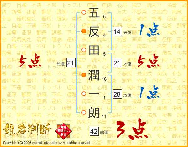 生活面を象徴する運勢です。外部から受ける影響力を表し、結婚運、家庭運や職場、環境への順応性を表します。総運から人運を引いた画数。姓や名が1文字の場合を除く。