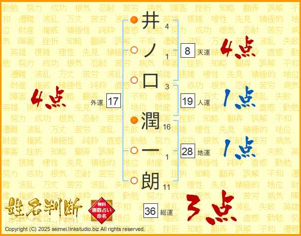 井(4画)ノ(1画)口(3画) 潤(16画)一(1画)朗(11画)