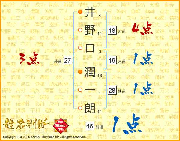 井(4画)野(11画)口(3画) 潤(16画)一(1画)朗(11画)