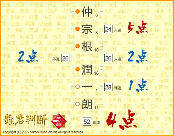 仲(6画)宗(8画)根(10画) 潤(16画)一(1画)朗(11画)