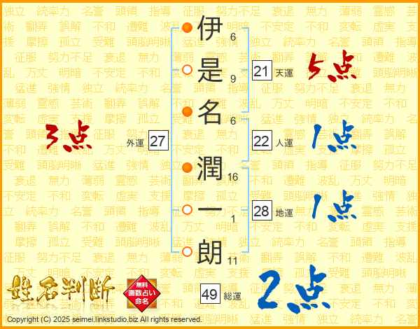 伊(6画)是(9画)名(6画) 潤(16画)一(1画)朗(11画)