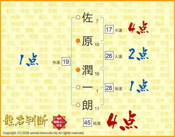 佐(7画)原(10画) 潤(16画)一(1画)朗(11画)