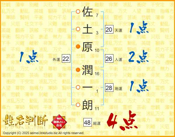 佐(7画)土(3画)原(10画) 潤(16画)一(1画)朗(11画)