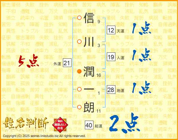 信(9画)川(3画) 潤(16画)一(1画)朗(11画)