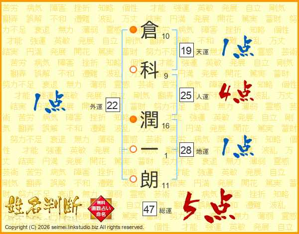 倉(10画)科(9画) 潤(16画)一(1画)朗(11画)