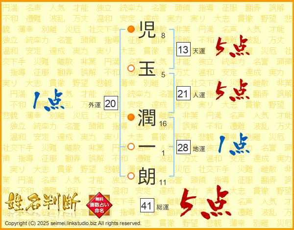 児(8画)玉(5画) 潤(16画)一(1画)朗(11画)
