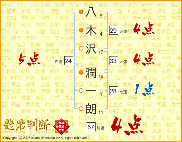 八(8画)木(4画)沢(17画) 潤(16画)一(1画)朗(11画)