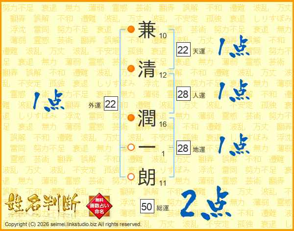 兼(10画)清(12画) 潤(16画)一(1画)朗(11画)