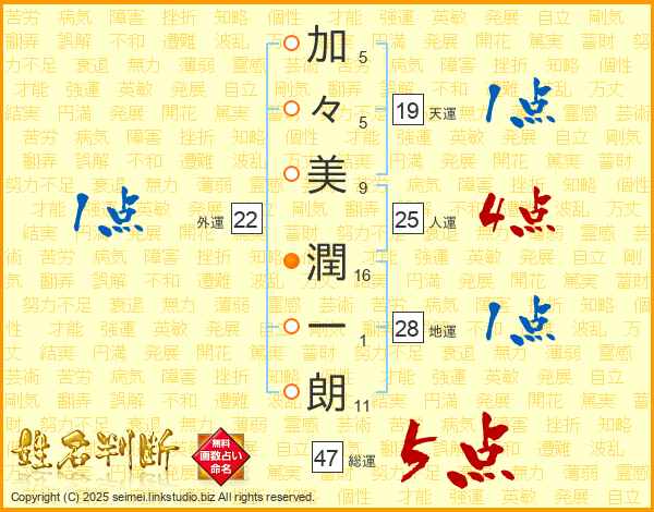 加(5画)々(5画)美(9画) 潤(16画)一(1画)朗(11画)