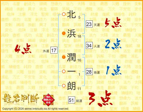北(5画)浜(18画) 潤(16画)一(1画)朗(11画)