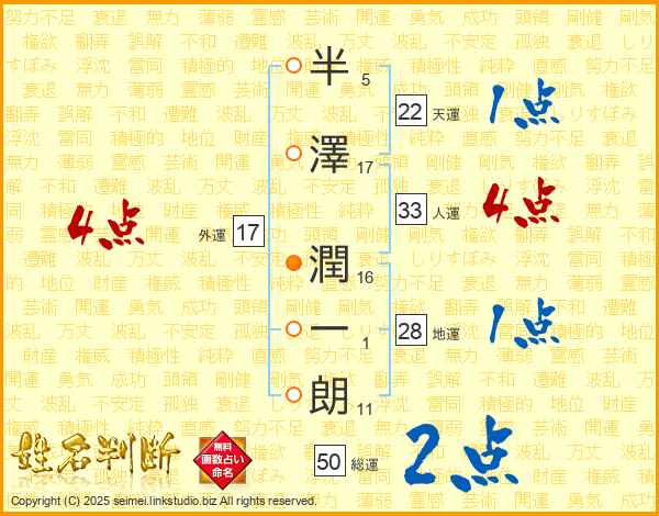 半(5画)澤(17画) 潤(16画)一(1画)朗(11画)