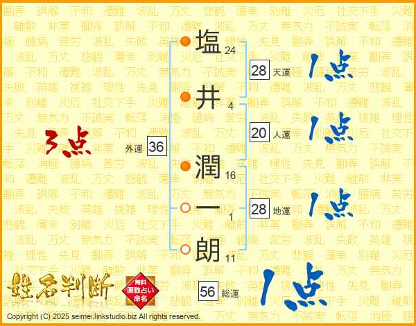 塩(24画)井(4画) 潤(16画)一(1画)朗(11画)