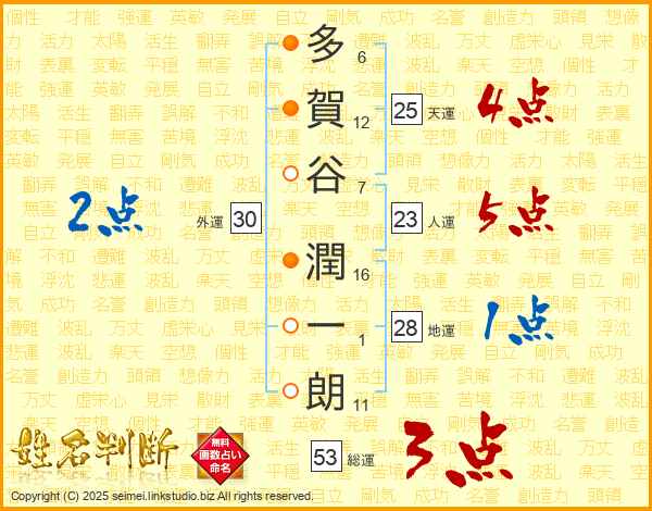 多(6画)賀(12画)谷(7画) 潤(16画)一(1画)朗(11画)