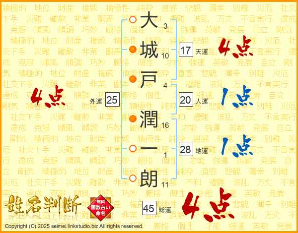 大(3画)城(10画)戸(4画) 潤(16画)一(1画)朗(11画)
