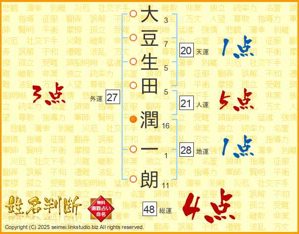 大(3画)豆(7画)生(5画)田(5画) 潤(16画)一(1画)朗(11画)