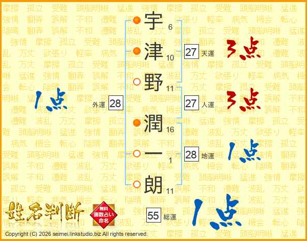 宇(6画)津(10画)野(11画) 潤(16画)一(1画)朗(11画)
