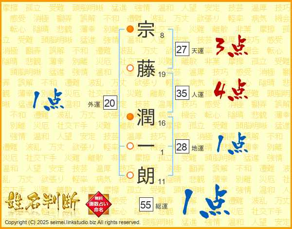 宗(8画)藤(19画) 潤(16画)一(1画)朗(11画)