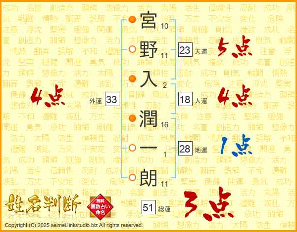 宮(10画)野(11画)入(2画) 潤(16画)一(1画)朗(11画)