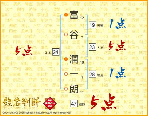 富(12画)谷(7画) 潤(16画)一(1画)朗(11画)