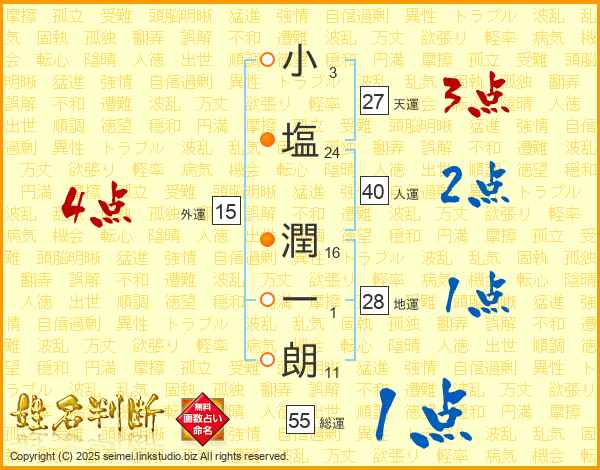 小(3画)塩(24画) 潤(16画)一(1画)朗(11画)
