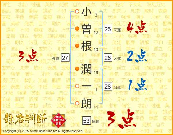 小(3画)曽(12画)根(10画) 潤(16画)一(1画)朗(11画)