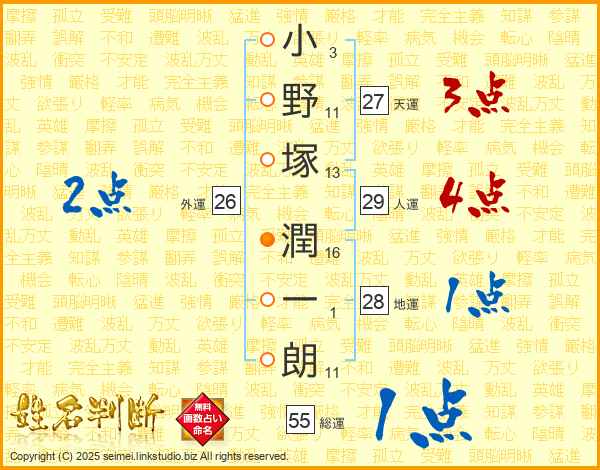 小(3画)野(11画)塚(13画) 潤(16画)一(1画)朗(11画)
