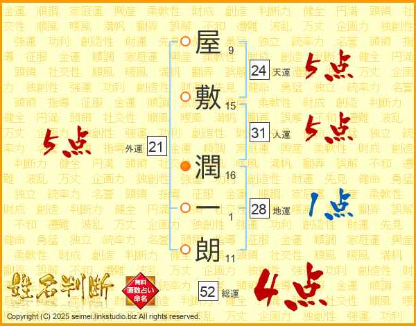 屋(9画)敷(15画) 潤(16画)一(1画)朗(11画)