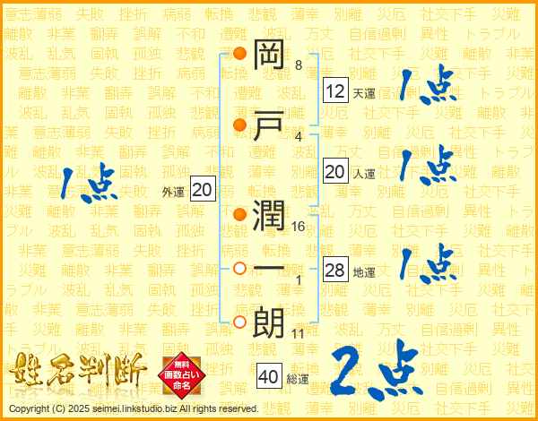 岡(8画)戸(4画) 潤(16画)一(1画)朗(11画)