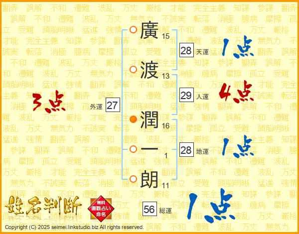 廣(15画)渡(13画) 潤(16画)一(1画)朗(11画)