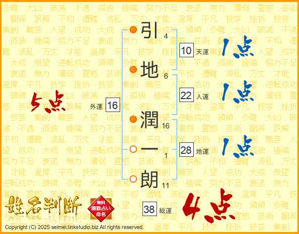引(4画)地(6画) 潤(16画)一(1画)朗(11画)