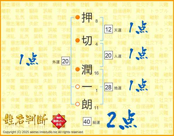 生活面を象徴する運勢です。外部から受ける影響力を表し、結婚運、家庭運や職場、環境への順応性を表します。総運から人運を引いた画数。姓や名が1文字の場合を除く。