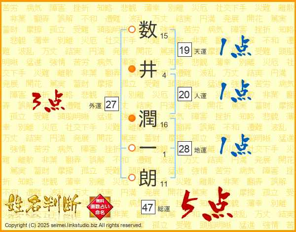 数(15画)井(4画) 潤(16画)一(1画)朗(11画)