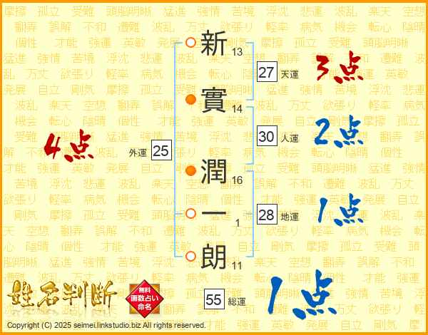 新(13画)實(14画) 潤(16画)一(1画)朗(11画)