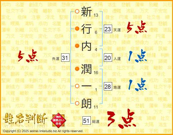 新(13画)行(6画)内(4画) 潤(16画)一(1画)朗(11画)