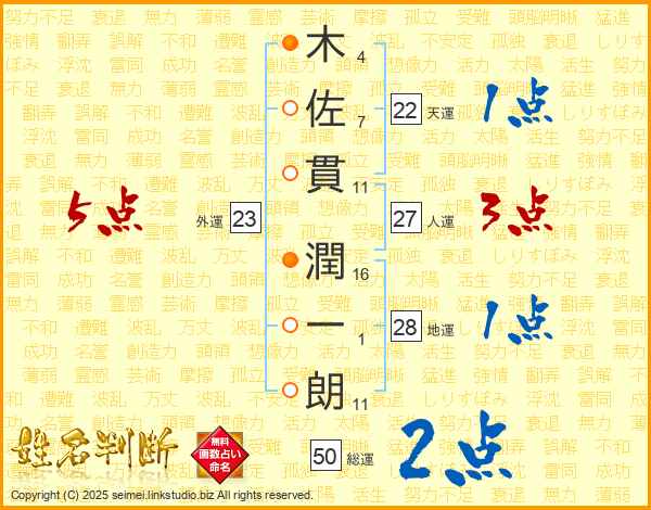 木(4画)佐(7画)貫(11画) 潤(16画)一(1画)朗(11画)